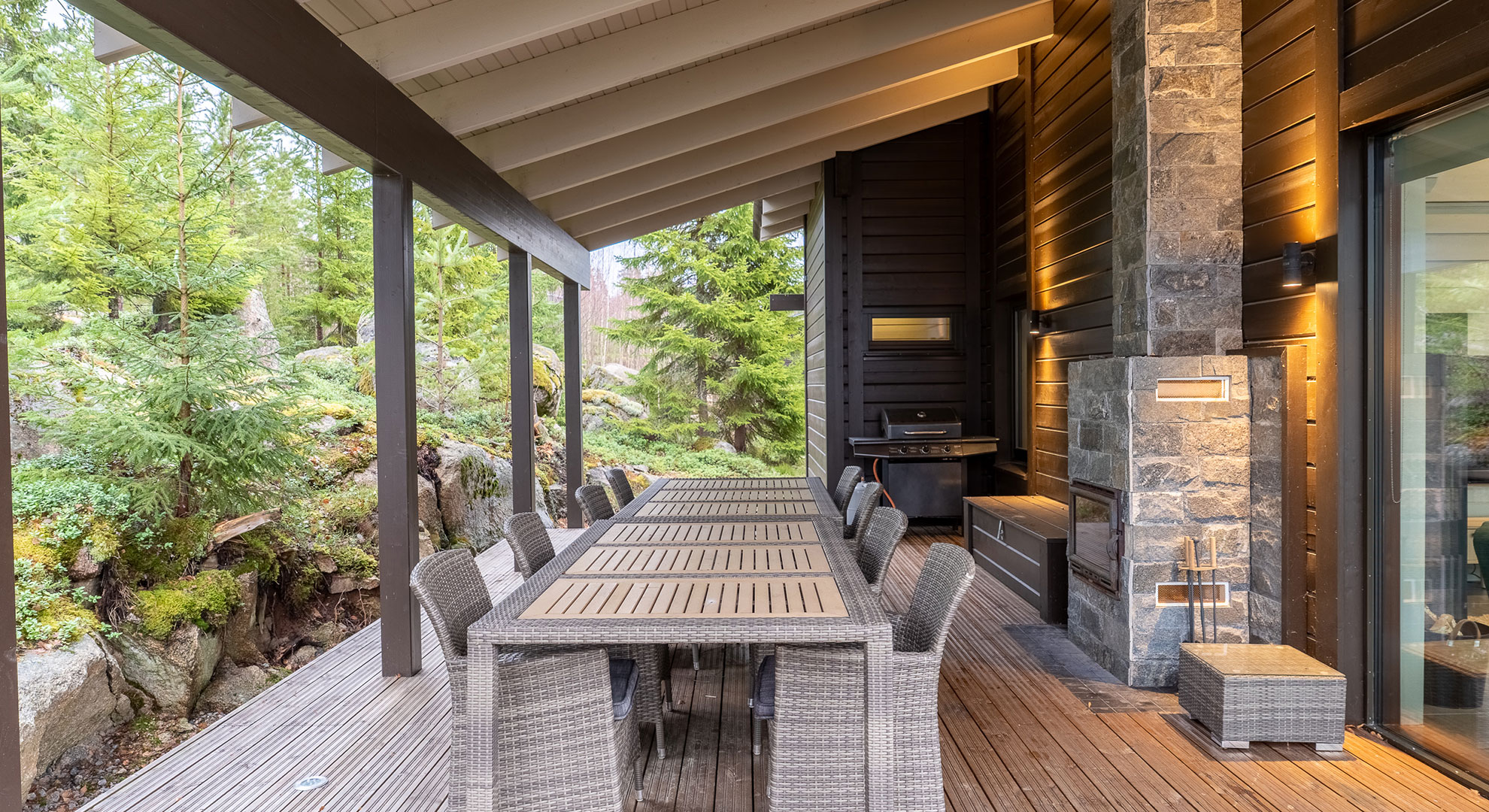 Iso katettu terassi järvelle päin ilta-aurinkoon. Terassilla tilava 12-hengen ruokailuryhmä sekä ulkotakka. Aurinkotuoleja löytyy kaksi sekä kaasugrilli.